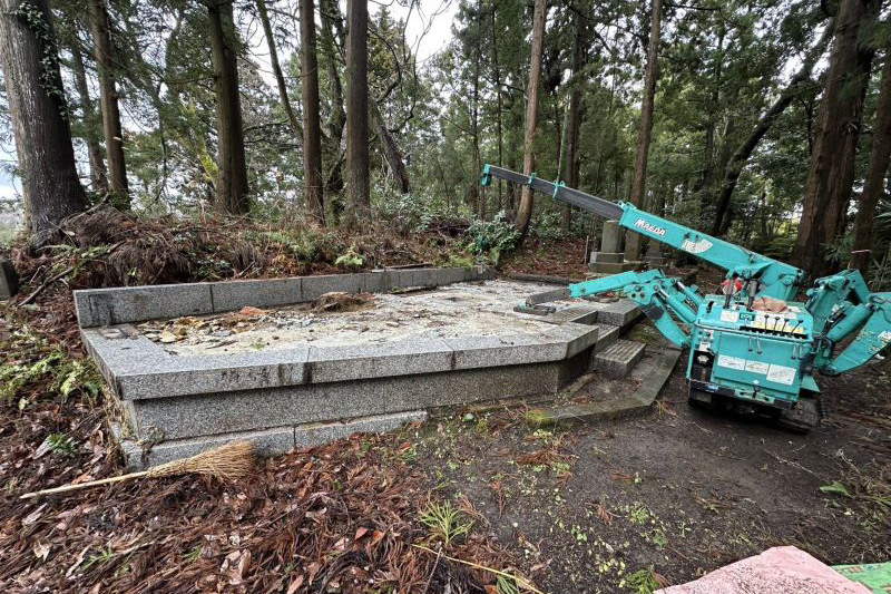 墓じまい 墓じまい 事例01 2026.04.16 周囲を木々に囲まれた墓所において、長年大切に守られてきた墓石の撤去工事を執り行いました。まず、石材の解体にあたってはクレーン等の専門機材を使用し、安全に細心の注意を払いながら慎重に作業を進めました。 全ての墓石および外構の撤去が完了した後は、基礎部分まで丁寧に取り除き、最終的に地面を平坦に整え、原状回復を行っております。弊社では、お客様の様々なご事情に寄り添い、行政手続きのアドバイスから現地の解体・整地まで、確かな技術で最後まで責任を持ってサポートさせていただきます。お墓の維持管理や承継でお悩みの方は、まずはお気軽にご相談ください。 実績一覧へ戻る
